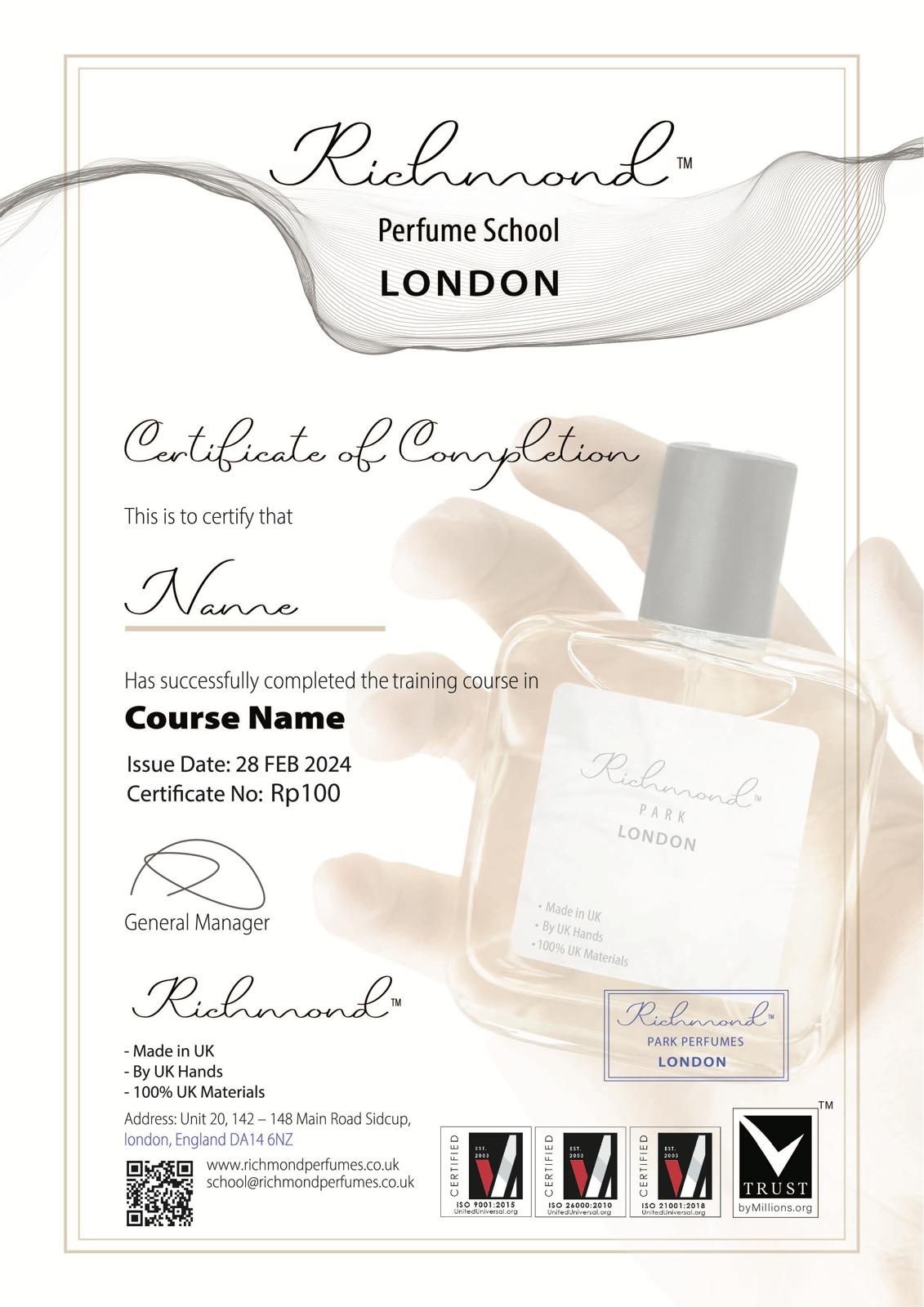 • البرنامج المعتمد: احصل على شهادة من مدرسة Richmond Park Perfume School التي تثبت مهاراتك التسويقية المتقدمة.